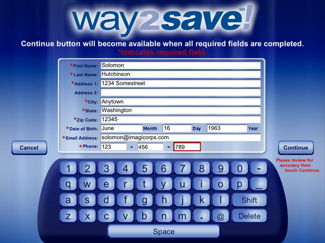The Wachovia Way2Save! Kiosk includes a looping screensaver built in Flash with animated background and text effects created in After Effects. The interface was designed for a touch screen, so the keyboard and controls accommodate finger control.
