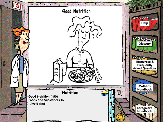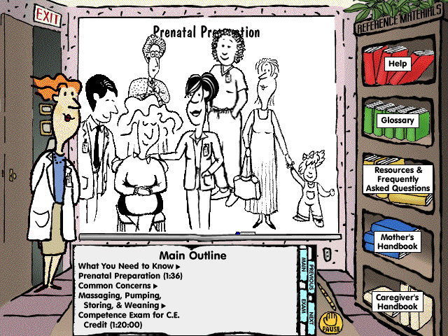 This continuing education CD for nurses also contained practical patient education with an avatar-based instructor illustrating points on an animated whiteboard. The classroom metaphor also included a bookshelf for additional resource material.