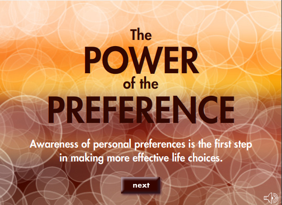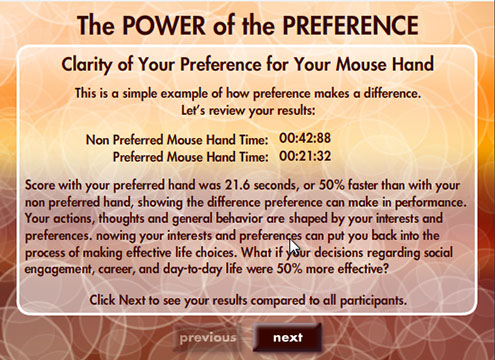 This Flash game uses a simple clicking exercise to compare results using the preferred mouse hand versus the non-preferred hand to illustrate how leveraging one's preferences can improve effectiveness in making life choices. (Demo does not connect to national averages database).