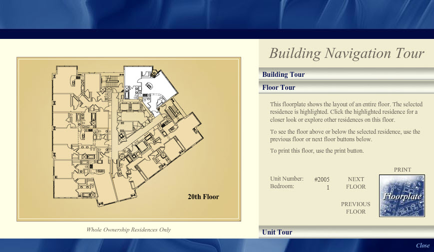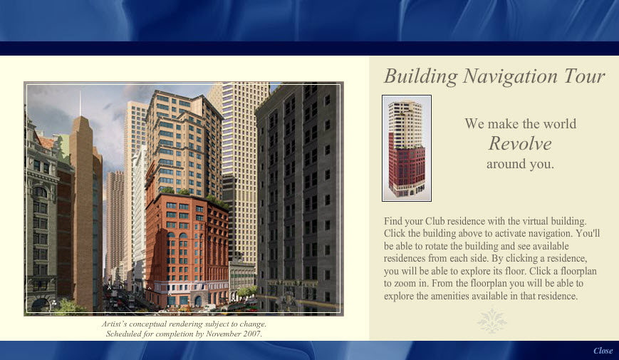 This interactive building tour, designed in Adobe Photoshop and developed in Flash, was one module in an interactive installation at the Chronicle Building in San Francisco for The Ritz-Carlton Club and Residences. By clicking the model of the building, sales staff would assist potential buyers through their selection of a Fractional Deeded Ownership unit.