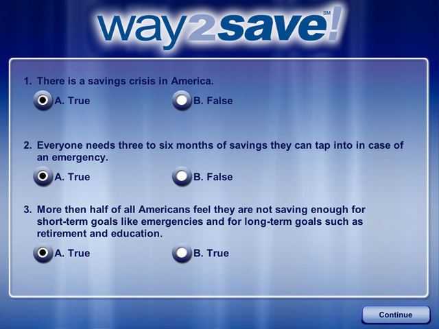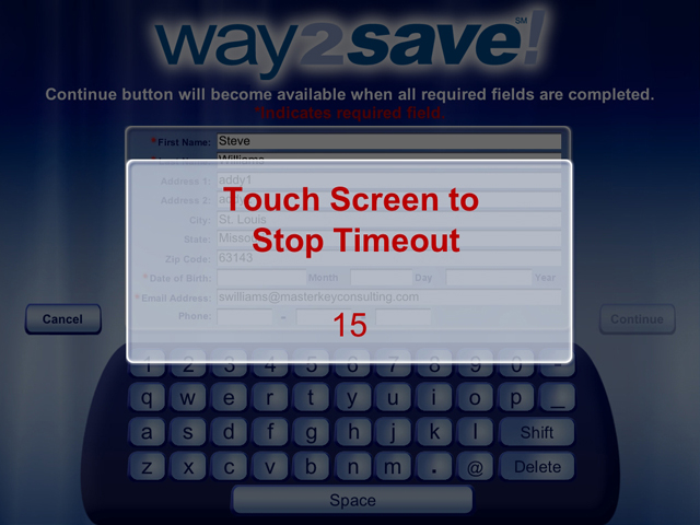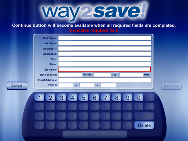 The Wachovia Way2Save! Kiosk includes a looping screensaver built in Flash with animated background and text effects created in After Effects. The interface was designed for a touch screen, so the keyboard and controls accommodate finger control.