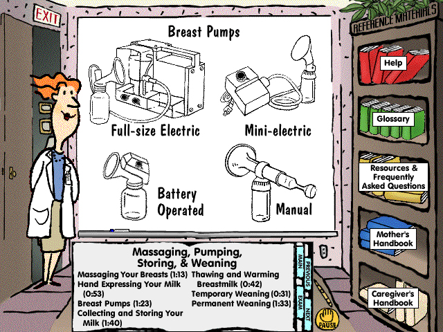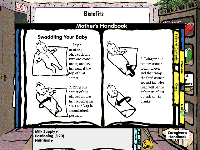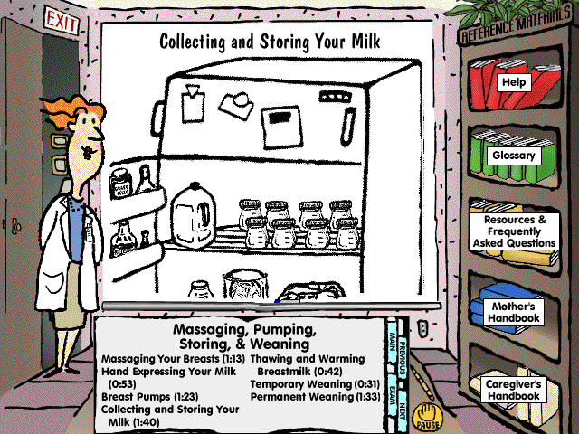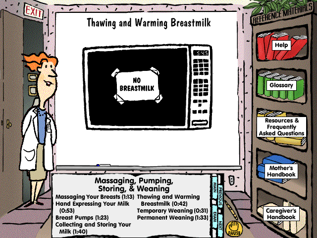 This continuing education CD for nurses also contained practical patient education with an avatar-based instructor illustrating points on an animated whiteboard. The classroom metaphor also included a bookshelf for additional resource material.