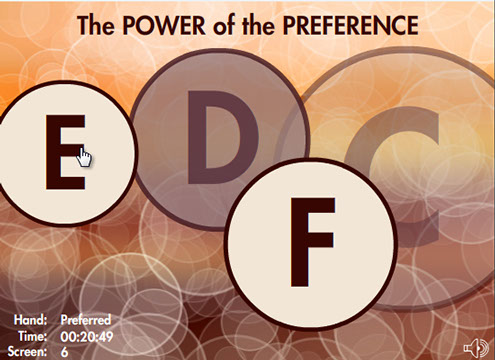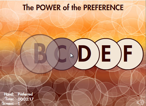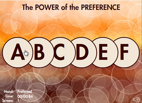This Flash game uses a simple clicking exercise to compare results using the preferred mouse hand versus the non-preferred hand to illustrate how leveraging one's preferences can improve effectiveness in making life choices. (Demo does not connect to national averages database).