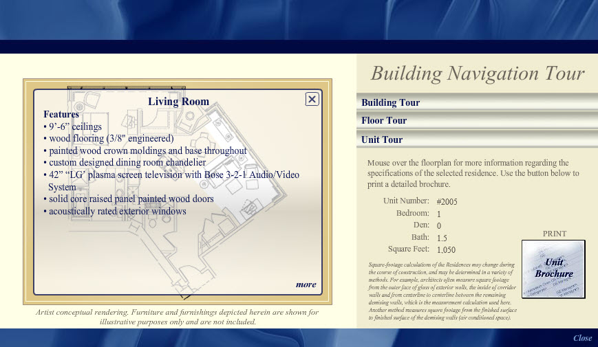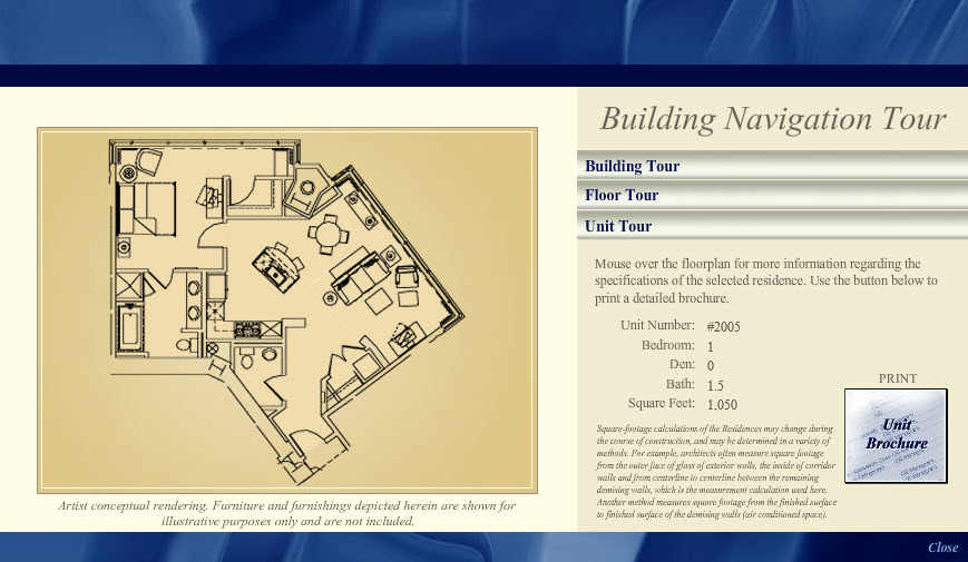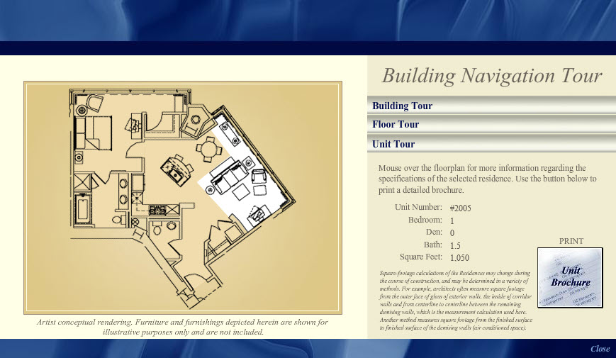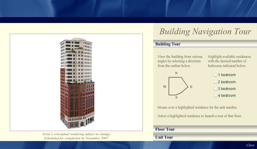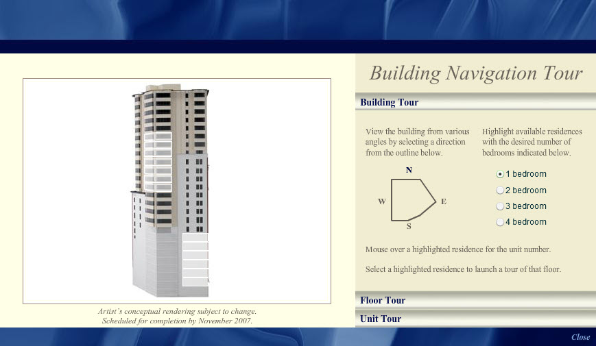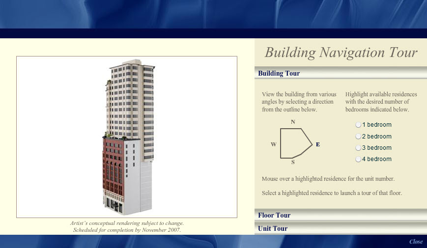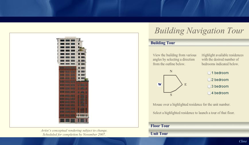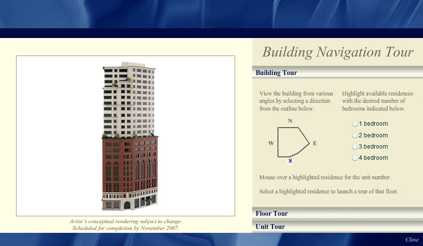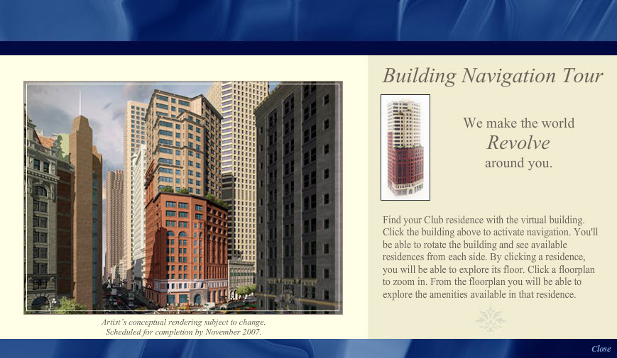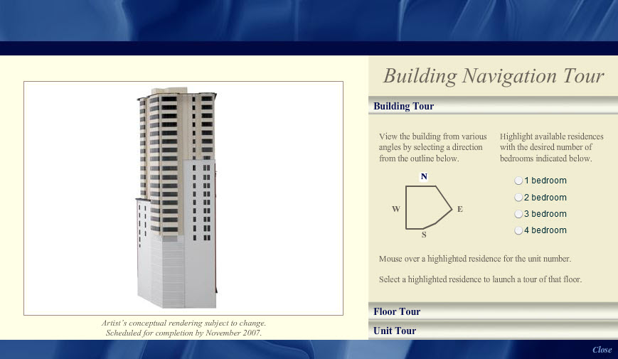 This interactive building tour, designed in Adobe Photoshop and developed in Flash, was one module in an interactive installation at the Chronicle Building in San Francisco for The Ritz-Carlton Club and Residences. By clicking the model of the building, sales staff would assist potential buyers through their selection of a Fractional Deeded Ownership unit.